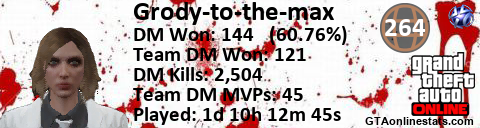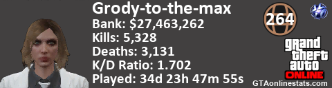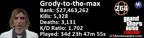 <a href="http://GTAonlinestats.com/showplayer/Grody-to-the-max"><img src="http://GTAonlinestats.com/dmsignature/Grody-to-the-max/sig.png" alt="Grody-to-the-max" border="0" /></a>