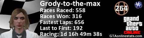 <a href="http://GTAonlinestats.com/showplayer/Grody-to-the-max"><img src="http://GTAonlinestats.com/racesignature/Grody-to-the-max/sig.png" alt="Grody-to-the-max" border="0" /></a>