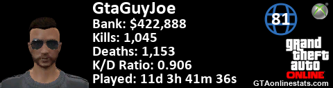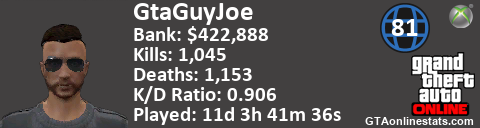[URL=http://GTAonlinestats.com/showplayer/GtaGuyJoe][IMG]http://GTAonlinestats.com/signature/GtaGuyJoe/sig.png[/IMG][/URL]