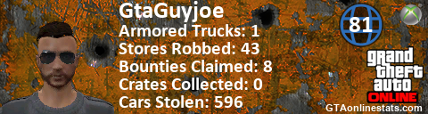 [URL=http://GTAonlinestats.com/showplayer/GtaGuyjoe][IMG]http://GTAonlinestats.com/crimesignature/GtaGuyjoe/sig.png[/IMG][/URL]