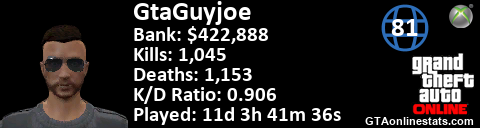 <a href="http://GTAonlinestats.com/showplayer/GtaGuyjoe"><img src="http://GTAonlinestats.com/dmsignature/GtaGuyjoe/sig.png" alt="GtaGuyjoe" border="0" /></a>