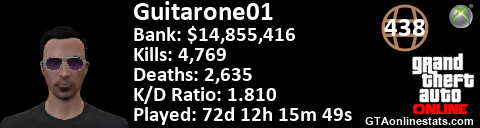 <a href="http://GTAonlinestats.com/showplayer/Guitarone01"><img src="http://GTAonlinestats.com/signature/Guitarone01/sig.png" alt="Guitarone01" border="0" /></a>