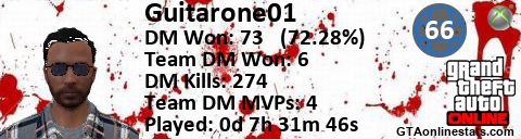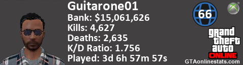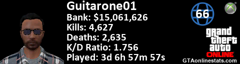 [URL=http://GTAonlinestats.com/showplayer/Guitarone01/2][IMG]http://GTAonlinestats.com/signature/Guitarone01/2/sig.png[/IMG][/URL]