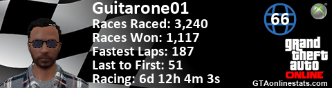 [URL=http://GTAonlinestats.com/showplayer/Guitarone01/2][IMG]http://GTAonlinestats.com/racesignature/Guitarone01/2/sig.png[/IMG][/URL]