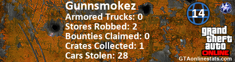 [URL=http://GTAonlinestats.com/showplayer/Gunnsmokez/2][IMG]http://GTAonlinestats.com/crimesignature/Gunnsmokez/2/sig.png[/IMG][/URL]