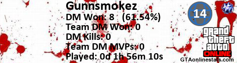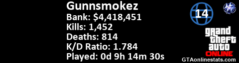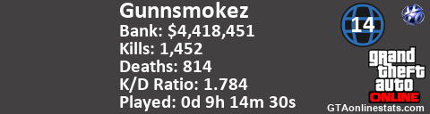 [URL=http://GTAonlinestats.com/showplayer/Gunnsmokez/2][IMG]http://GTAonlinestats.com/dmsignature/Gunnsmokez/2/sig.png[/IMG][/URL]