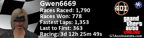 <a href="http://GTAonlinestats.com/showplayer/Gwen6669"><img src="http://GTAonlinestats.com/racesignature/Gwen6669/sig.png" alt="Gwen6669" border="0" /></a>