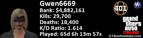 [URL=http://GTAonlinestats.com/showplayer/Gwen6669][IMG]http://GTAonlinestats.com/signature/Gwen6669/sig.png[/IMG][/URL]