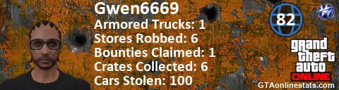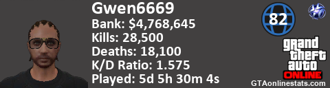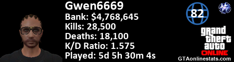 [URL=http://GTAonlinestats.com/showplayer/Gwen6669/2][IMG]http://GTAonlinestats.com/signature/Gwen6669/2/sig.png[/IMG][/URL]