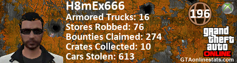<a href="http://GTAonlinestats.com/showplayer/H8mEx666"><img src="http://GTAonlinestats.com/crimesignature/H8mEx666/sig.png" alt="H8mEx666" border="0" /></a>
