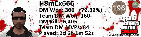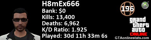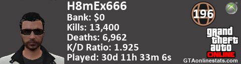 <a href="http://GTAonlinestats.com/showplayer/H8mEx666"><img src="http://GTAonlinestats.com/dmsignature/H8mEx666/sig.png" alt="H8mEx666" border="0" /></a>