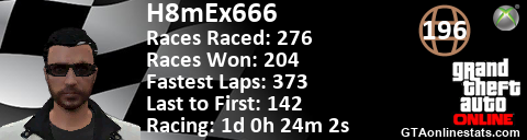 <a href="http://GTAonlinestats.com/showplayer/H8mEx666"><img src="http://GTAonlinestats.com/racesignature/H8mEx666/sig.png" alt="H8mEx666" border="0" /></a>