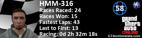 <a href="http://GTAonlinestats.com/showplayer/HMM-316"><img src="http://GTAonlinestats.com/racesignature/HMM-316/sig.png" alt="HMM-316" border="0" /></a>