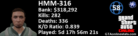 <a href="http://GTAonlinestats.com/showplayer/HMM-316"><img src="http://GTAonlinestats.com/signature/HMM-316/sig.png" alt="HMM-316" border="0" /></a>