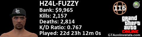 <a href="http://GTAonlinestats.com/showplayer/HZ4L-FUZZY"><img src="http://GTAonlinestats.com/randomsignature/HZ4L-FUZZY/sig.png" alt="HZ4L-FUZZY" border="0" /></a>