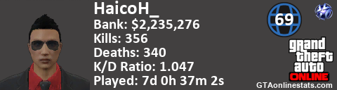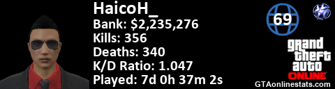 [URL=http://GTAonlinestats.com/showplayer/HaicoH_][IMG]http://GTAonlinestats.com/signature/HaicoH_/sig.png[/IMG][/URL]