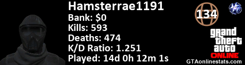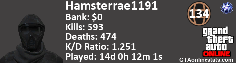 <a href="http://GTAonlinestats.com/showplayer/Hamsterrae1191"><img src="http://GTAonlinestats.com/randomsignature/Hamsterrae1191/sig.png" alt="HamsterRae1191" border="0" /></a>