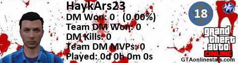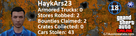 [URL=http://GTAonlinestats.com/showplayer/HaykArs23/2][IMG]http://GTAonlinestats.com/signature/HaykArs23/2/sig.png[/IMG][/URL]