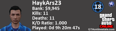 <a href="http://GTAonlinestats.com/showplayer/HaykArs23/2"><img src="http://GTAonlinestats.com/signature/HaykArs23/2/sig.png" alt="HaykArs23" border="0" /></a>