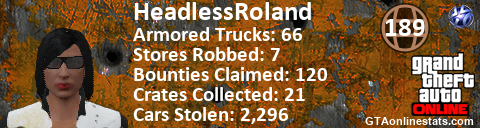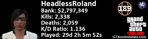 <a href="http://GTAonlinestats.com/showplayer/HeadlessRoland"><img src="http://GTAonlinestats.com/randomsignature/HeadlessRoland/sig.png" alt="HeadlessRoland" border="0" /></a>