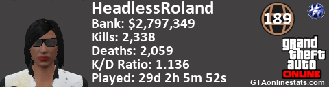 <a href="http://GTAonlinestats.com/showplayer/HeadlessRoland"><img src="http://GTAonlinestats.com/dmsignature/HeadlessRoland/sig.png" alt="HeadlessRoland" border="0" /></a>