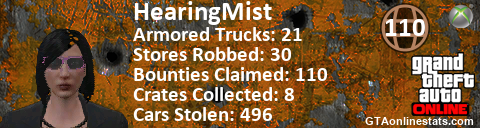 [URL=http://GTAonlinestats.com/showplayer/HearingMist][IMG]http://GTAonlinestats.com/crimesignature/HearingMist/sig.png[/IMG][/URL]