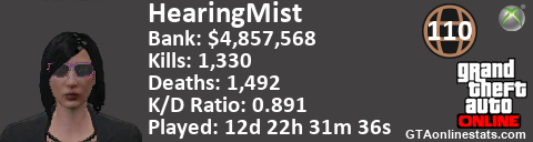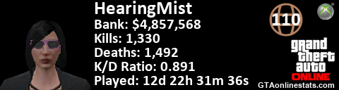 [URL=http://GTAonlinestats.com/showplayer/HearingMist][IMG]http://GTAonlinestats.com/signature/HearingMist/sig.png[/IMG][/URL]