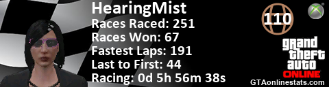 [URL=http://GTAonlinestats.com/showplayer/HearingMist][IMG]http://GTAonlinestats.com/racesignature/HearingMist/sig.png[/IMG][/URL]
