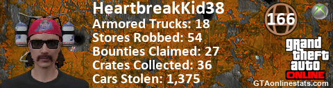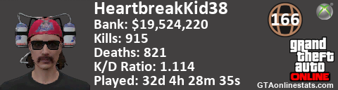 [URL=http://GTAonlinestats.com/showplayer/HeartbreakKid38][IMG]http://GTAonlinestats.com/signature/HeartbreakKid38/sig.png[/IMG][/URL]