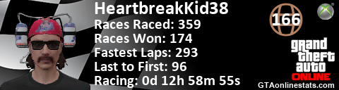 <a href="http://GTAonlinestats.com/showplayer/HeartbreakKid38"><img src="http://GTAonlinestats.com/racesignature/HeartbreakKid38/sig.png" alt="HeartbreakKid38" border="0" /></a>