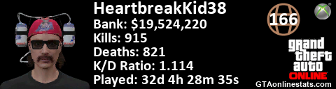 <a href="http://GTAonlinestats.com/showplayer/HeartbreakKid38"><img src="http://GTAonlinestats.com/signature/HeartbreakKid38/sig.png" alt="HeartbreakKid38" border="0" /></a>