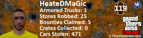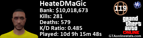 <a href="http://GTAonlinestats.com/showplayer/HeateDMaGic"><img src="http://GTAonlinestats.com/randomsignature/HeateDMaGic/sig.png" alt="HeateDMaGic" border="0" /></a>