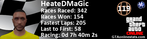 <a href="http://GTAonlinestats.com/showplayer/HeateDMaGic"><img src="http://GTAonlinestats.com/racesignature/HeateDMaGic/sig.png" alt="HeateDMaGic" border="0" /></a>