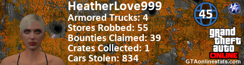 [URL=http://GTAonlinestats.com/showplayer/HeatherLove999][IMG]http://GTAonlinestats.com/crimesignature/HeatherLove999/sig.png[/IMG][/URL]