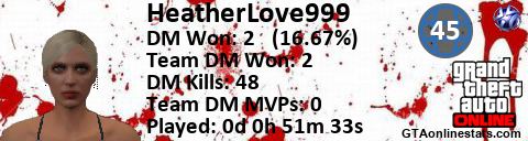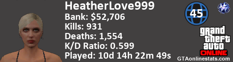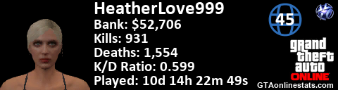 <a href="http://GTAonlinestats.com/showplayer/HeatherLove999"><img src="http://GTAonlinestats.com/dmsignature/HeatherLove999/sig.png" alt="HeatherLove999" border="0" /></a>