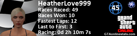 <a href="http://GTAonlinestats.com/showplayer/HeatherLove999"><img src="http://GTAonlinestats.com/racesignature/HeatherLove999/sig.png" alt="HeatherLove999" border="0" /></a>