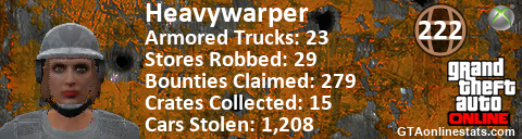 [URL=http://GTAonlinestats.com/showplayer/Heavywarper/2][IMG]http://GTAonlinestats.com/crimesignature/Heavywarper/2/sig.png[/IMG][/URL]
