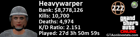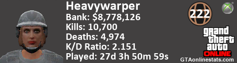 [URL=http://GTAonlinestats.com/showplayer/Heavywarper/2][IMG]http://GTAonlinestats.com/signature/Heavywarper/2/sig.png[/IMG][/URL]