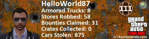 [URL=http://GTAonlinestats.com/showplayer/HelloWorld87][IMG]http://GTAonlinestats.com/crimesignature/HelloWorld87/sig.png[/IMG][/URL]