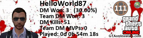 [URL=http://GTAonlinestats.com/showplayer/HelloWorld87][IMG]http://GTAonlinestats.com/dmsignature/HelloWorld87/sig.png[/IMG][/URL]