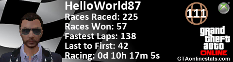 [URL=http://GTAonlinestats.com/showplayer/HelloWorld87][IMG]http://GTAonlinestats.com/racesignature/HelloWorld87/sig.png[/IMG][/URL]