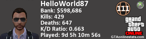 <a href="http://GTAonlinestats.com/showplayer/HelloWorld87"><img src="http://GTAonlinestats.com/signature/HelloWorld87/sig.png" alt="HelloWorld87" border="0" /></a>