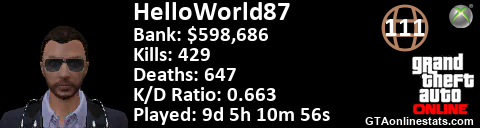 <a href="http://GTAonlinestats.com/showplayer/HelloWorld87"><img src="http://GTAonlinestats.com/randomsignature/HelloWorld87/sig.png" alt="HelloWorld87" border="0" /></a>