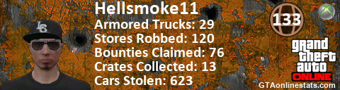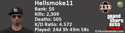 [URL=http://GTAonlinestats.com/showplayer/Hellsmoke11][IMG]http://GTAonlinestats.com/signature/Hellsmoke11/sig.png[/IMG][/URL]