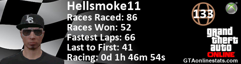 <a href="http://GTAonlinestats.com/showplayer/Hellsmoke11"><img src="http://GTAonlinestats.com/racesignature/Hellsmoke11/sig.png" alt="Hellsmoke11" border="0" /></a>