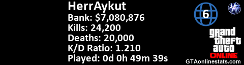 [URL=http://GTAonlinestats.com/showplayer/HerrAykut/2][IMG]http://GTAonlinestats.com/signature/HerrAykut/2/sig.png[/IMG][/URL]