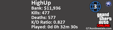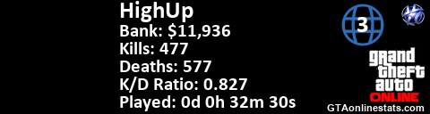 [URL=http://GTAonlinestats.com/showplayer/HighUp/2][IMG]http://GTAonlinestats.com/randomsignature/HighUp/2/sig.png[/IMG][/URL]