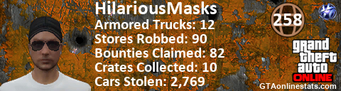 <a href="http://GTAonlinestats.com/showplayer/HilariousMasks"><img src="http://GTAonlinestats.com/randomsignature/HilariousMasks/sig.png" alt="HilariousMasks" border="0" /></a>