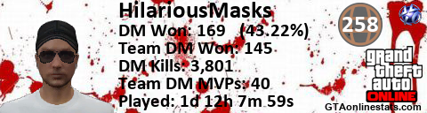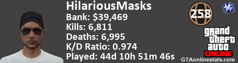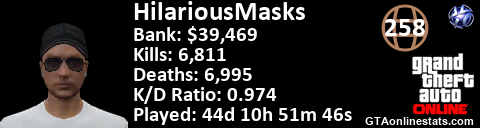 <a href="http://GTAonlinestats.com/showplayer/HilariousMasks"><img src="http://GTAonlinestats.com/dmsignature/HilariousMasks/sig.png" alt="HilariousMasks" border="0" /></a>