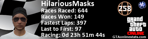 [URL=http://GTAonlinestats.com/showplayer/HilariousMasks][IMG]http://GTAonlinestats.com/racesignature/HilariousMasks/sig.png[/IMG][/URL]
